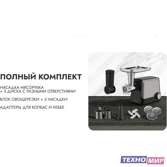 Полная комплектация | мясорубка, диск/решетка для фарша (3 шт.), насадка для кеббе, насадка для домашней колбасы, насадка для шинковки, терка (3 шт.), загрузочный лоток, нож, толкатель, фиксирующая гайка, шнек |