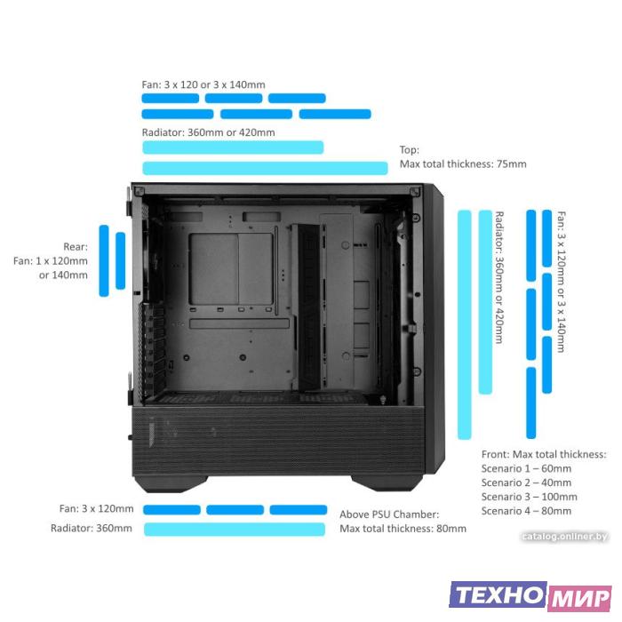Расположение СЖО | Спереди: 360 мм или 420 мм Верх: 360 мм или 420 мм Над камерой блока питания: 360 мм |